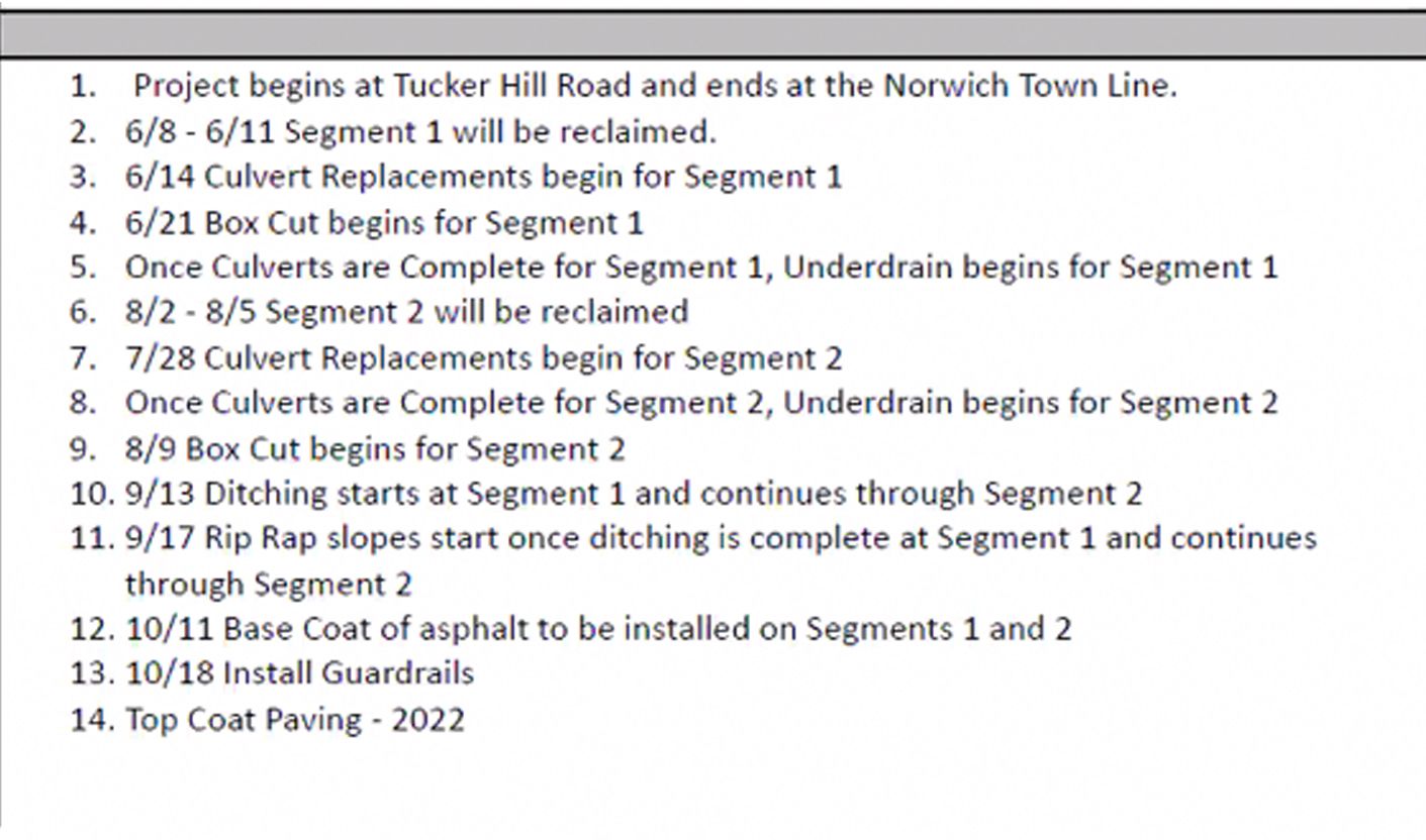 As for the timeline of reconstruction, the Phase 2 part of the project will be divided into two segments: Segment 1 will cover from Tucker Hill Rd to Cream Street. Segment 2 will cover Cream Street to the Norwich line.