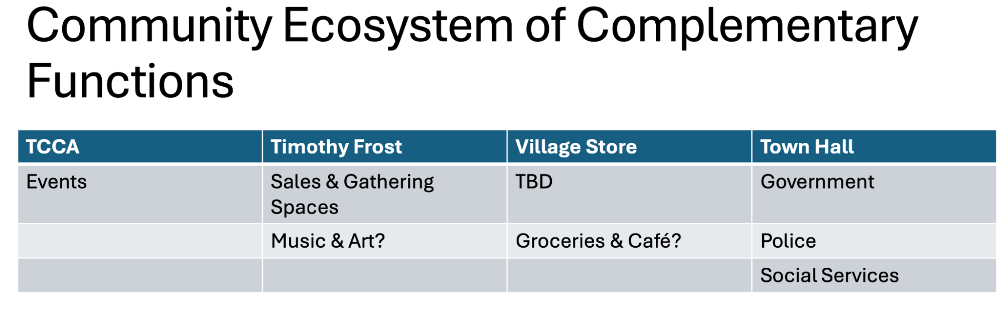 This looks like a possible scenario for village center revitalization, with three buildings, the TCCA, the T. Frost, and the Village Store offering complementary services and attractions.