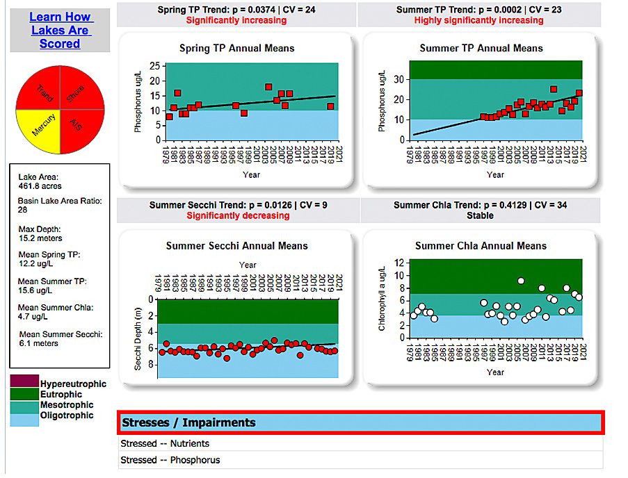 The VT Agency of Natural Resources is keeping tabs on all the lakes in the state through its Lake Scorecard program in which the results of scientific measurements of lake water quality and degree of shoreline degradation are summarized. Lake Fairlee’s scorecard shows it has slipped since the 1980s from borderline to firmly Mesotrophic and may be edging into Eutrophic according to the Summer Chla (chlorophyll a) data that indicate the amount of algae.