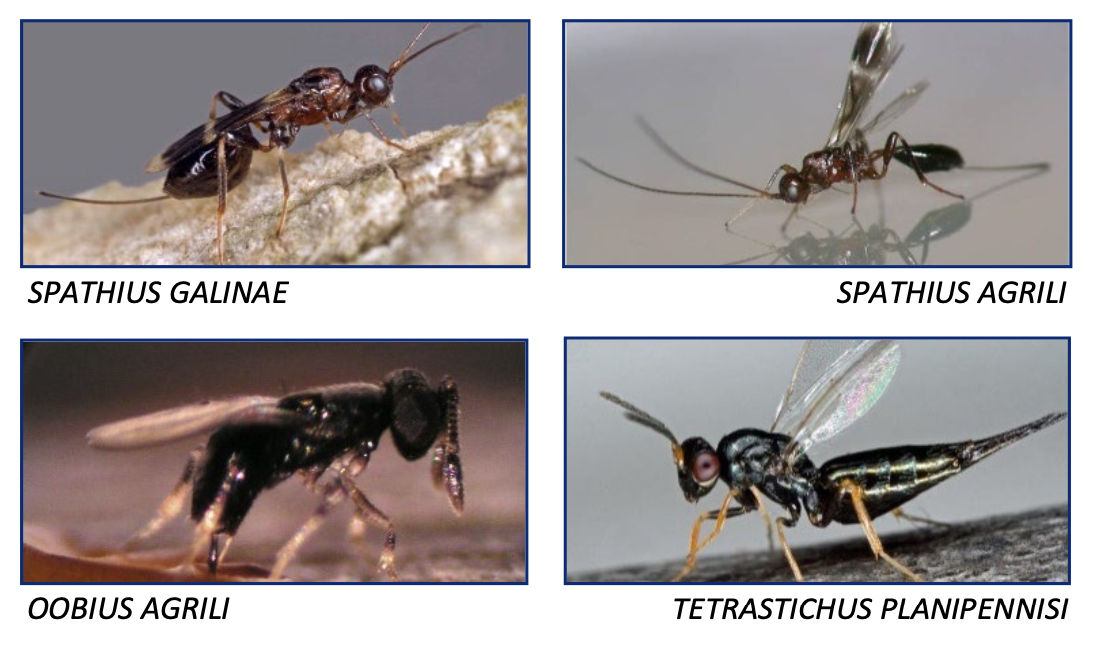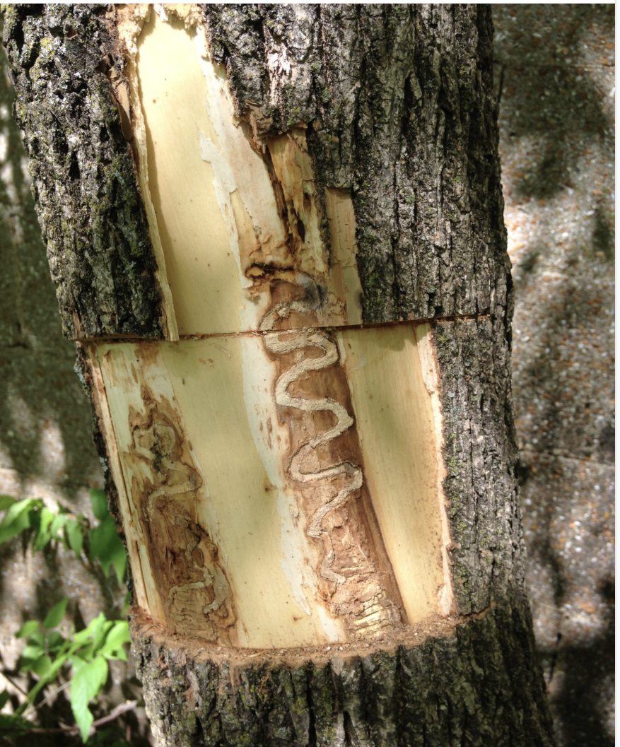 Another hopeful advance is the introduction by the USDA Animal and Plant Health Inspection Service, or APHIS, of natural predators of Emerald ash borer. Research in the parts of Asia where ash borer is native discovered four wasp species, all tiny, that search out and kill ash borers. They do this by laying their eggs on the ash borer larvae that are feeding under the bark or on the ash borer eggs that are deposited in bark cracks. The wasp larvae that hatch take care of the borer. These wasps are stingless.