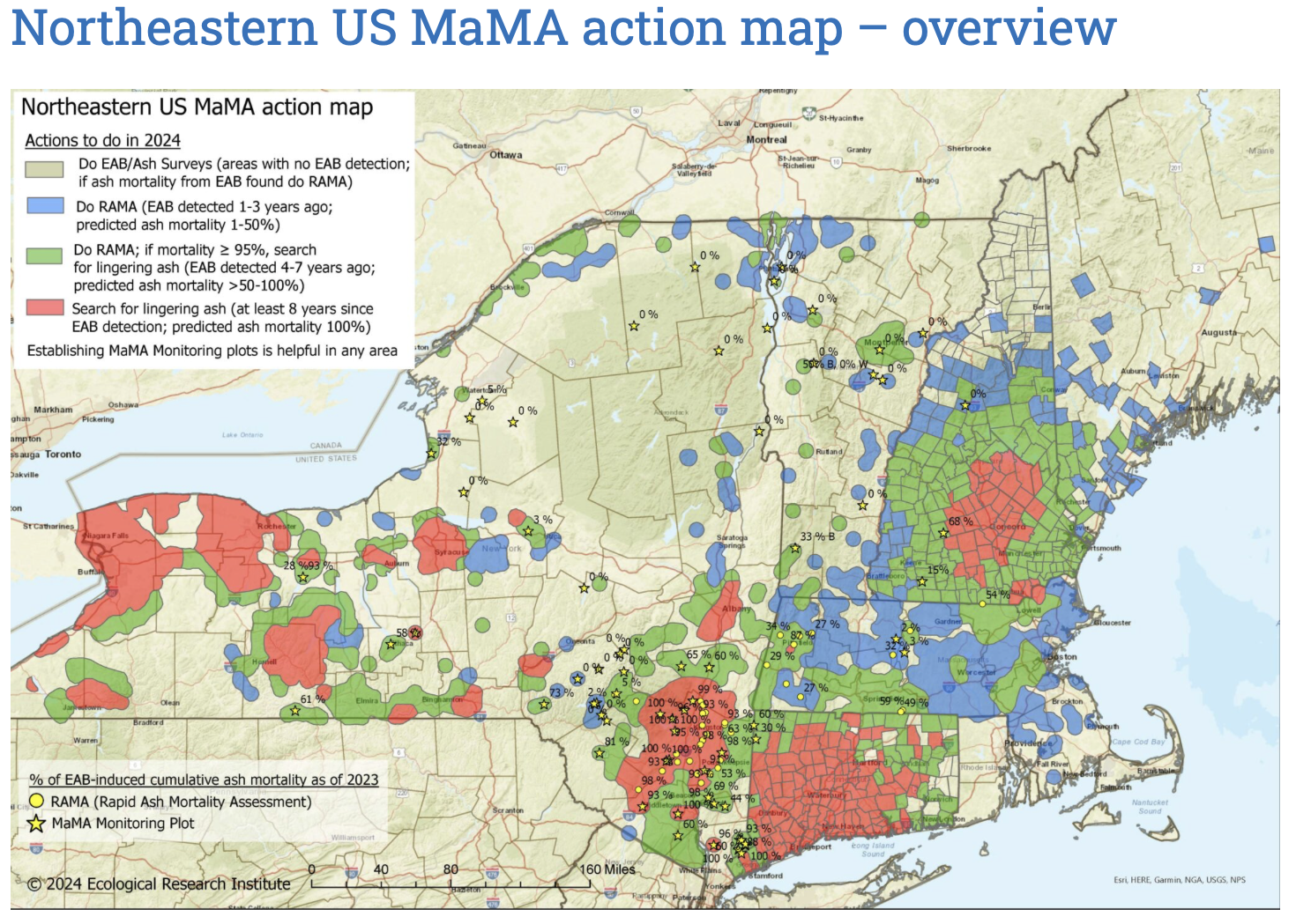 The wasps have been released, first in Michigan in 2007 and now in 30 other states and the District of Columbia. In total, more than eight million wasps were released, and they appear to have become established in 22 states, though to what extent is unclear. A follow-up study in Michigan found that wasp introduction killed 20-80% of ash borers in trees up to 8 inches in diameter. In addition, regeneration of ash trees was observed in those areas where wasps were released. APHIS states that the wasps will not eradicate ash borer, but they can be used to manage the pest as part of an integrated pest management approach. APHIS produces the wasps in captivity and calculates the number of infested sites that they can treat, based on Emerald ash borer Program priorities and guidelines