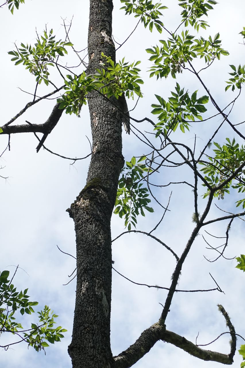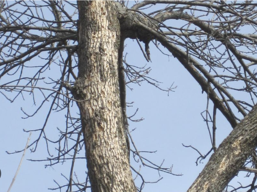 It was the persistent tapping of a woodpecker that drew attention to the two ash trees beside Poor Farm Road. Peering upward, it was evident that the crowns had lost over half their leaves, revealing many dead branches. The characteristic "woodpecker flecking," the result of woodpeckers chipping off flakes of bark to reach the invading pests, was also plainly visible on the upper trunk and main branches.