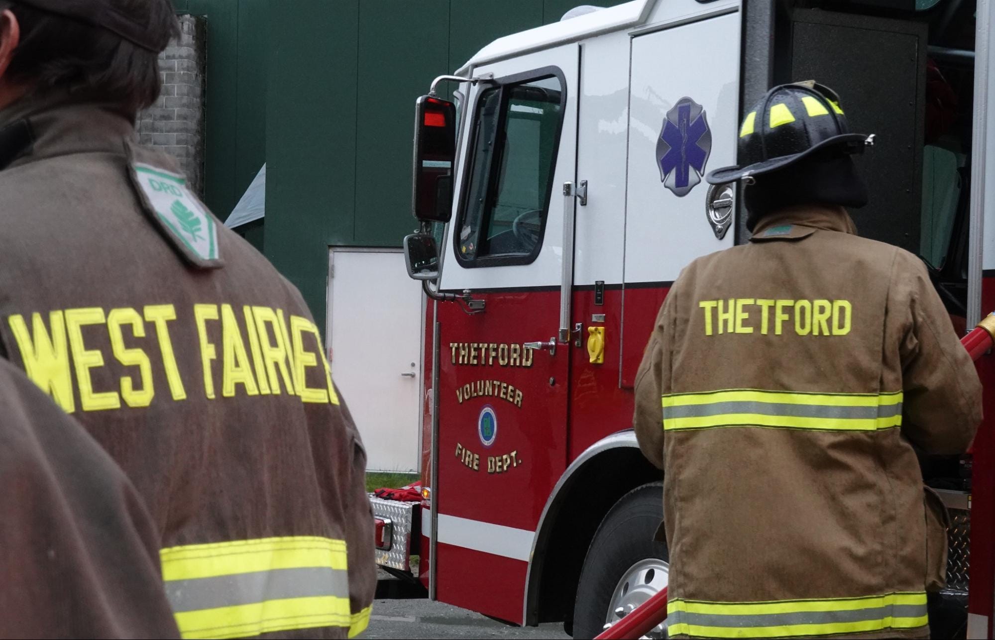 Responding towns were Thetford, Norwich, West Fairlee, Fairlee, Lyme, Hanover, and Strafford. The Upper Valley Ambulance was on the scene, as was VT EMS District #9. The firefighters themselves were too numerous to easily count. It was an impressive show of mutual aid, without which a community would be hard pressed to control such a situation, one which could have developed very quickly into a serious and economically devastating conflagration. As it was, two firefighters may have suffered burns.
