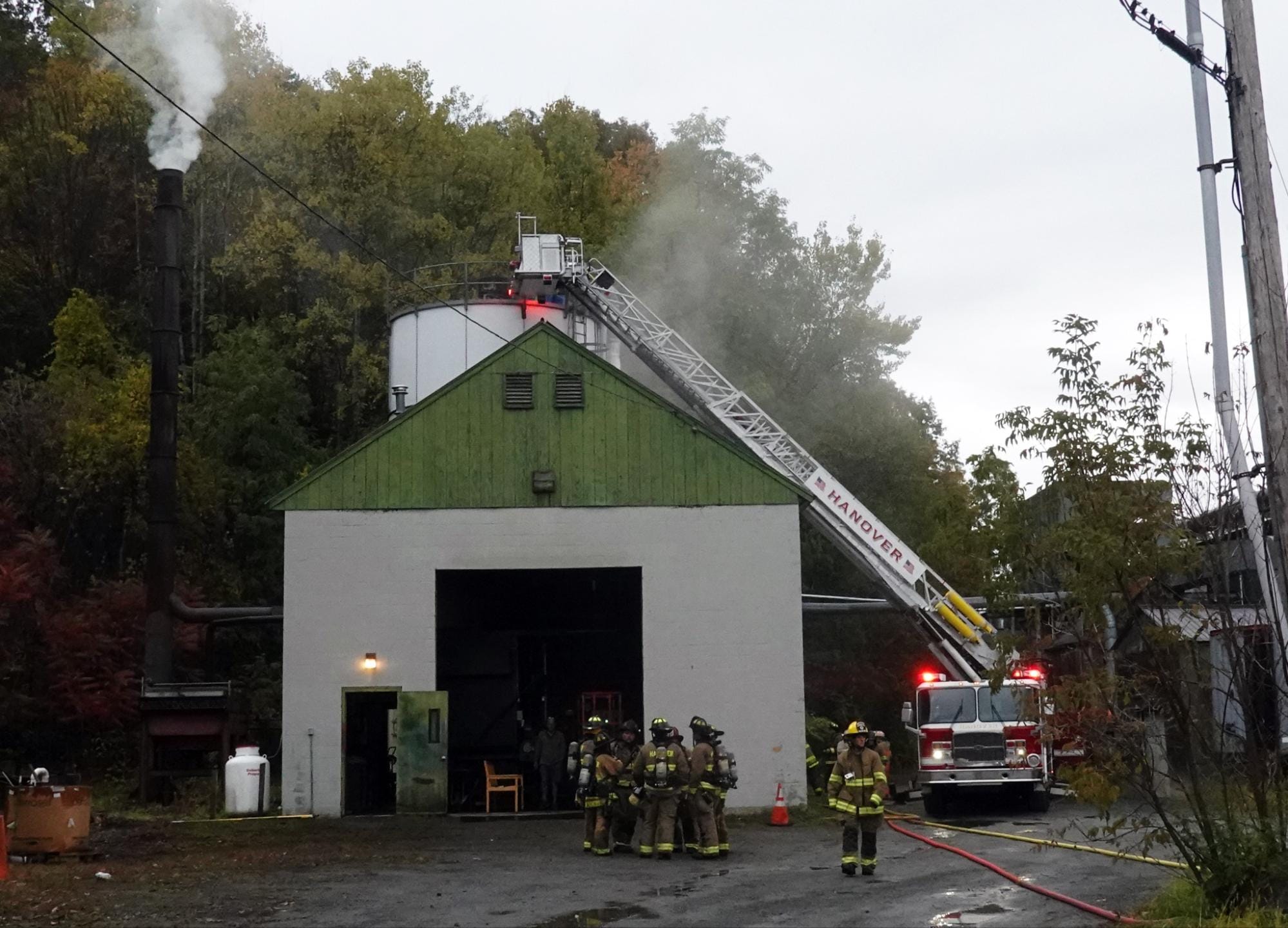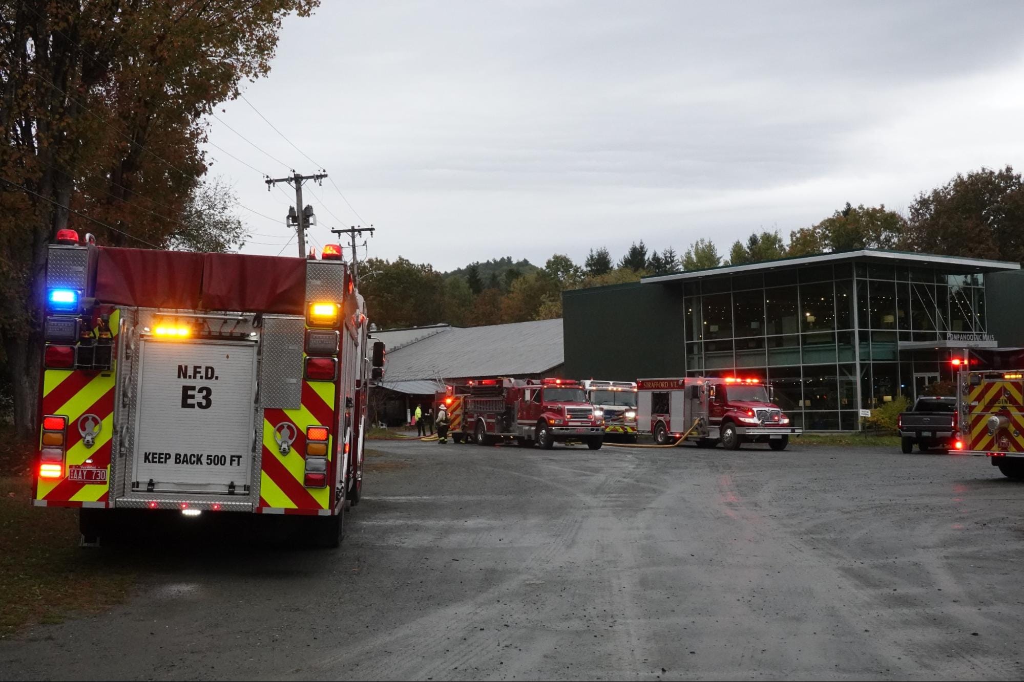 Around 6:00 am on Monday an alert went out that there was a fire at the Pompanoosuc Mills furniture manufacturing plant in East Thetford. By the time 8:00 am rolled around fire trucks from all surrounding towns were convened on the site and many firefighters were standing by. Thetford's truck was pumping water by a long hose into the factory's wood chip-fired heating plant. A long ladder extended from a Hanover truck to the top of the silo where wood chips, the waste from furniture-making, are stored.