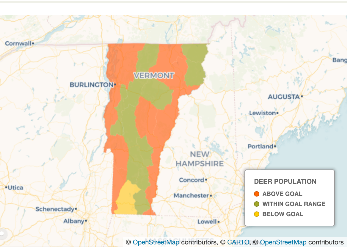 Seedling trees make for easy forage, and browsing by an overabundance of deer stops the reproduction of most hardwood trees except beech, decimating forest diversity in many areas. An average deer eats over 4,000 tree seedling tips in one day. Even at 12-18 deer per square mile — the "preferred density" for deer, according to the VT Department of Fish and Wildlife — it's not hard to see why forest diversity has plummeted. And deer exceed this preferred density in large swaths of the state, including Thetford and Orange county (see map).