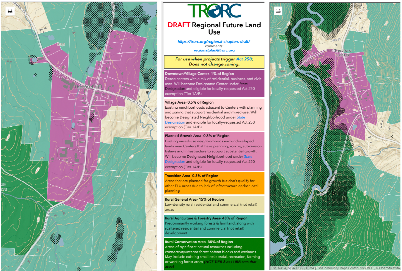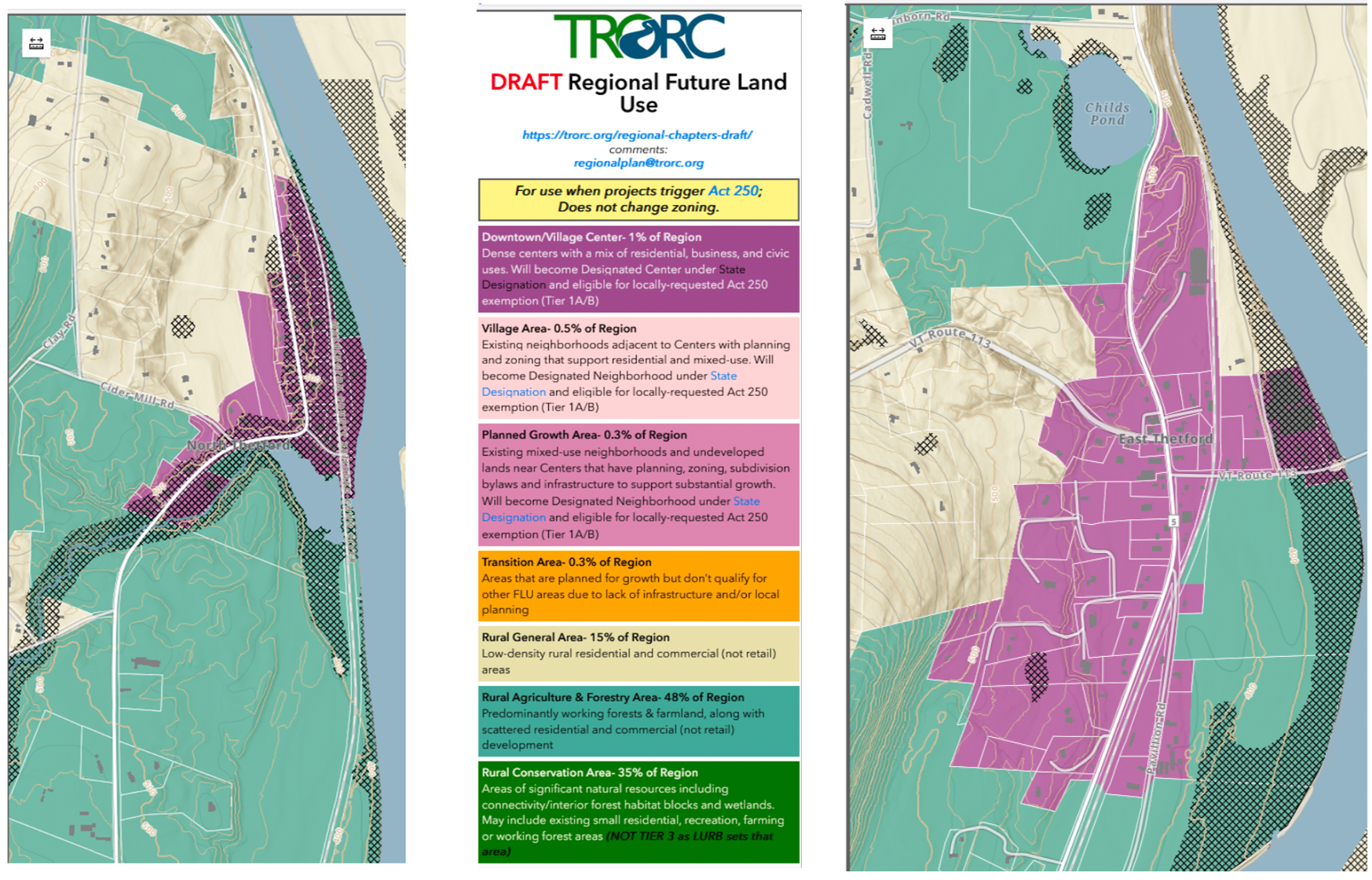 Regarding Thetford, the Two Rivers Regional Planning Commission (TRORC) has already mapped the provisional Tier 1B areas abutting five villages: Post Mills, North Thetford, East Thetford, Thetford Hill, and Thetford Center. Chief Planner Kevin Geiger presented the maps to the Thetford Selectboard on February 2nd with some additional information: The maps of Tier 1B areas will only apply if the selectboard "requests Tier 1B as part of the Regional Plan." Then any Tier 1B areas requested in Thetford must be approved by the Land Use Review Board that is tasked with transitioning Act 250 to location-based jurisdiction as well as creating new areas of Act 250 exemption to promote responsible development.