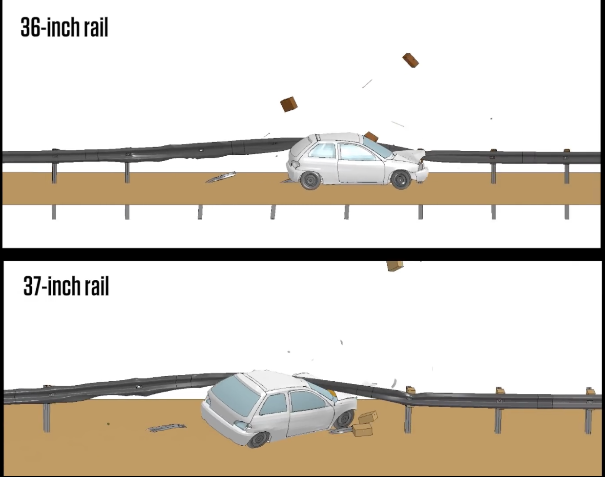 In the 1960s, the guardrail design that came into favor un the eastern US was the one dubbed the “weak-post” design because the W-beam was mounted on “weak” wooden posts. It was adopted because crash tests in the early ‘60s showed that the previously popular “strong-post” design caused damaging deceleration to a vehicle striking the guardrail. More evidence came from the State of New York’s analysis of two years’ worth of road accidents. It found that strong-post crashes were 3.3% fatal with 15.8% hospitalizations, while weak-post crashes were 1.9% fatal with 10.8% hospitalization. In the weak-post system, the posts were only intended to hold the W-beam in position. Upon vehicle impact, the beam separated from the posts but kept its contact with the vehicle, restraining it until it came to rest. However, in some cases the W-beam would fail to disconnect from the posts. If the posts broke and fell, they pulled the guardrail to the ground, allowing the vehicle to shoot over the top.