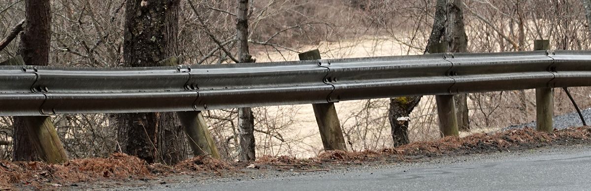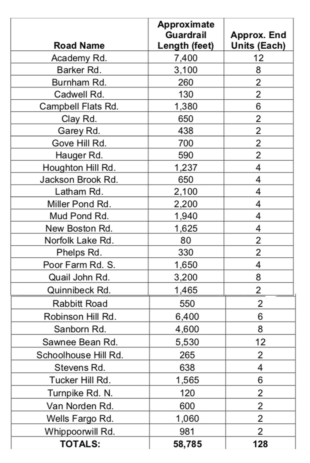 Academy Road, which boasts several stretches of aged guardrail, is listed as needing 7,400 ft of new guardrail, plus 12 end units, in the table below.