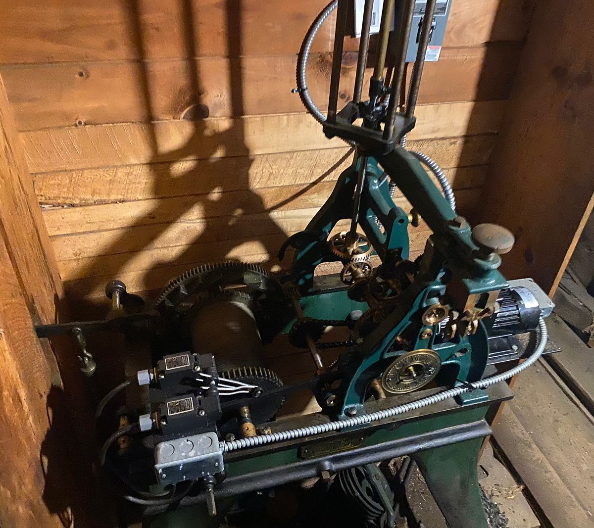Originally the clock keeper had to climb to the tower once a week to wind both the clock and the bell chime mechanism. After 110 years of this ritual the movement was electrified in 2011. Michael admires the precision of the new set of gears that were added to step down the rotation of the electric motor to the exact speed for turning the hands of the clock. While there is no need for a weekly winding, the clock still needs to be adjusted after every power outage. Michael found this could be agonizingly slow if the hands had to be moved to adjust the time back — there is a knob that moves the hand forward only by one minute for every turn. However, moving the hands a few minutes is not so hard.
