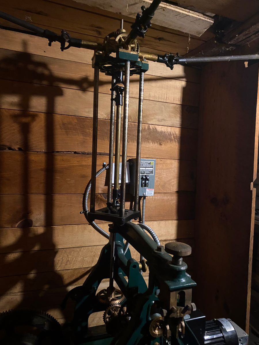 Until recently the clock was serviced once a year by a man named Bob Rodgers, who came from Pennsylvania every fall on his “New England tour,” visiting all the clocks at town halls, churches and other buildings. His business, inherited from his father, was to oil and service the clockwork mechanisms. Bob Rodgers did not like one detail of the clock’s electrification in which electric switches linked the timekeeping mechanism to a separate motor that ran the chime. Bob replaced them with mercury switches that sense the position of the clock mechanism. He also installed a timer so that the clock would not chime at all hours throughout the night. After 9:00 pm it would not chime until 8:00 am the next morning. There was a little idiosyncrasy — on re-starting, the chime mechanism behaved as though the hands were at the top of the dial and thus chimed twelve times at 8:00 am. But recent power outages undid the controller, and the 24-hour chiming has resumed.