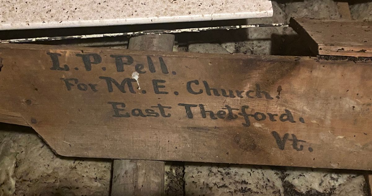 According to historic records the Timothy Frost clock was given to the Methodist church in 1901 by William Porter, a multi-millionaire in Boston who never forgot that Thetford was his birthplace. The clock was shipped to East Thetford, most likely to the train station. We know the destination because pieces of the wooden shipping crate are still in the church attic. The resourceful craftsmen who installed the clock used wood from the crate to construct the steps from the attic to the clock tower. Michael is not joking when he says, “The stairs look as though they were built of scrapwood.”