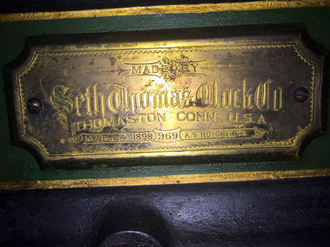 The clock itself is a Seth Thomas, bearing a plaque that reads “1898.” The Seth Thomas company, based in Connecticut, started in 1814 with clocks that ran on gears carved from mountain laurel wood. From these beginnings they became the designers and manufacturers of timepieces considered to be among the best. Brass movements were introduced in 1842. The company became a major producer of tower clocks after 1872.