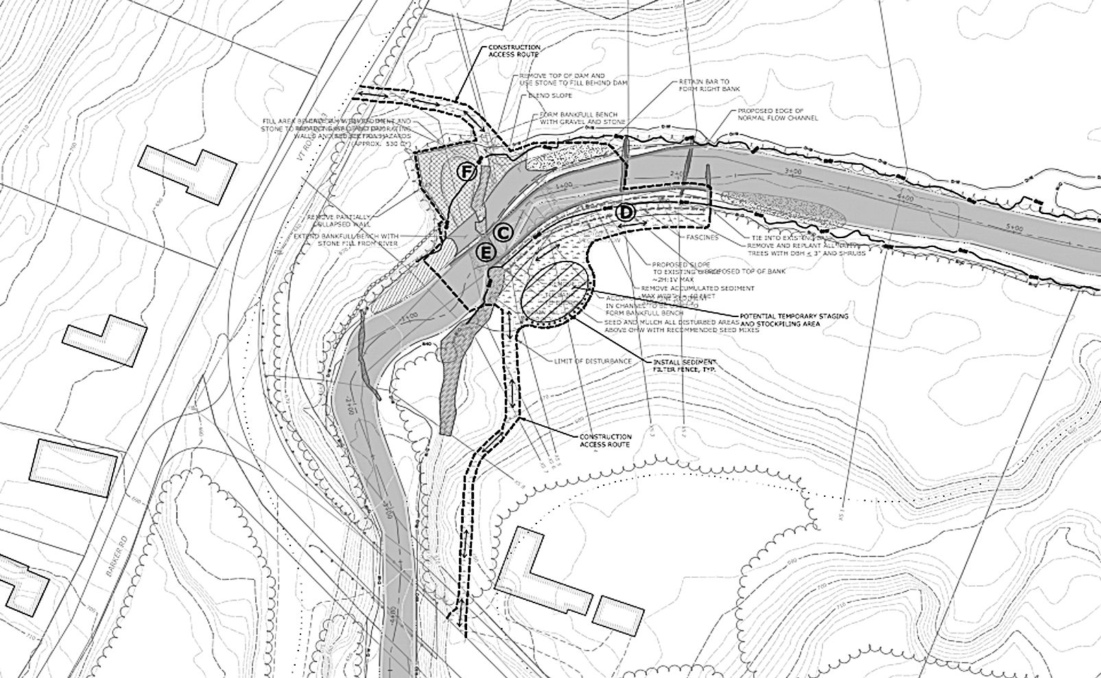 Multiple parties are involved in this project. The plan has the support of dam owner Walter Malmquist, who also owns the now-demolished mill. The abutting neighbors approve as well. Also consulted were the Vermont Division for Historic Preservation and experts in Cultural Resources who review any “project, activity, or program… that can result in a change in the character or use of an historic property or historic resource.” The dam was inspected by the DEC, the US Fish and Wildlife Services, and other agencies. The parties agreed that a portion of the stone structure would be retained. The concrete portion of the dam and the sediment will be removed. Fall hazards will be reduced. Enough of the river channel will be restored to allow fish passage and reduce risks of flooding and erosion damage to nearby properties.