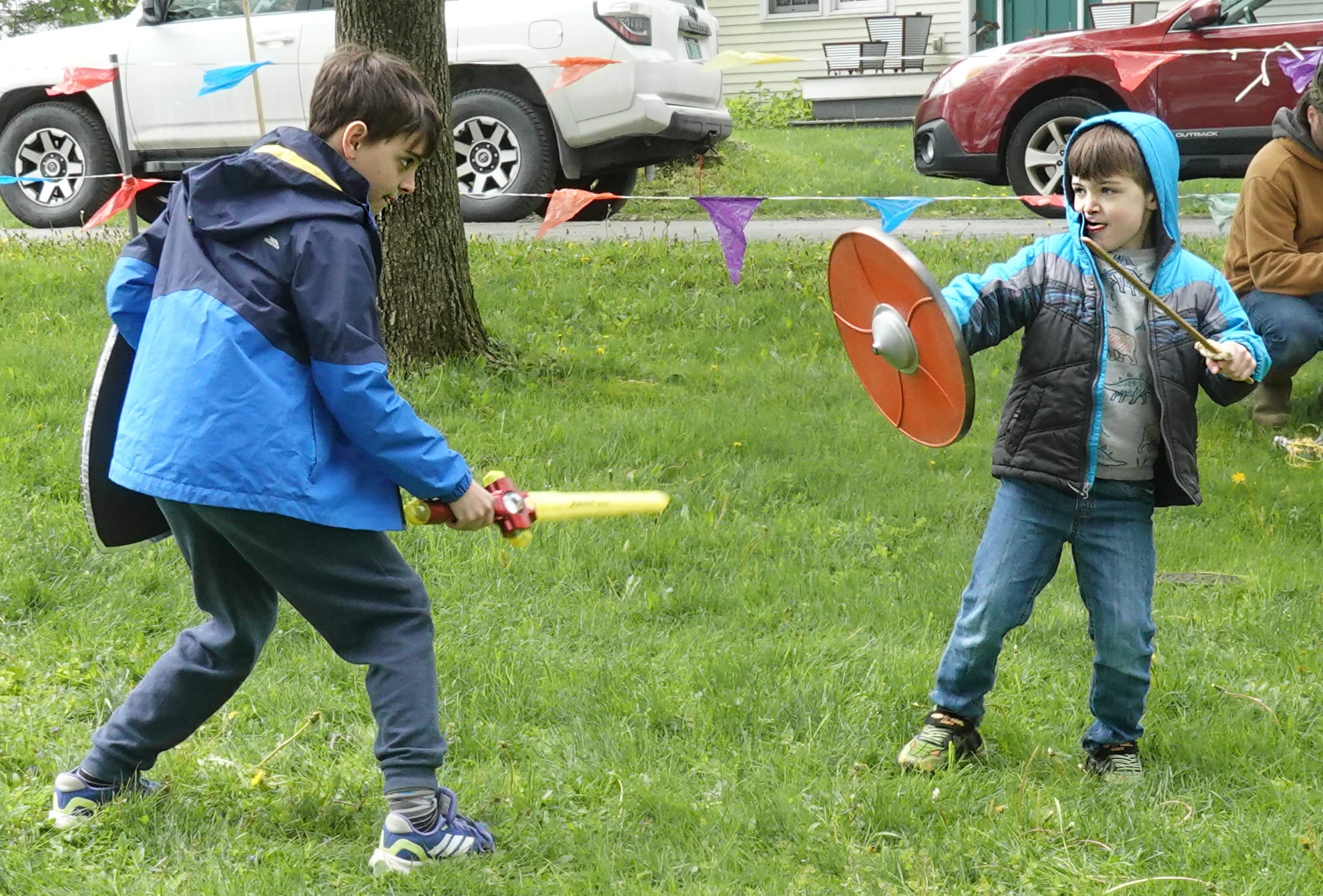 To augment the funds raised from its tuition fees Open Fields holds a variety of fundraising events. As Nellie summarized, one of them is the Medieval Festival. This started back in the late 1990s, possibly in 1998, as an event that ran every other year. It alternated with the Goose Egg Auction, a highly-anticipated sale of goose eggs decorated in ornate or whimsical styles by area artists, authors and illustrators. They were prized by collectors. But the Goose Egg auction became a casualty of the pandemic, the next one had been planned for October of 2021. Instead the school was forced by COVID to close for the first half of 2020, reopening in the fall with full masking. Nellie noted with some pride that not a single person contracted COVID at the school for the duration of the pandemic that officially ended in 2023.